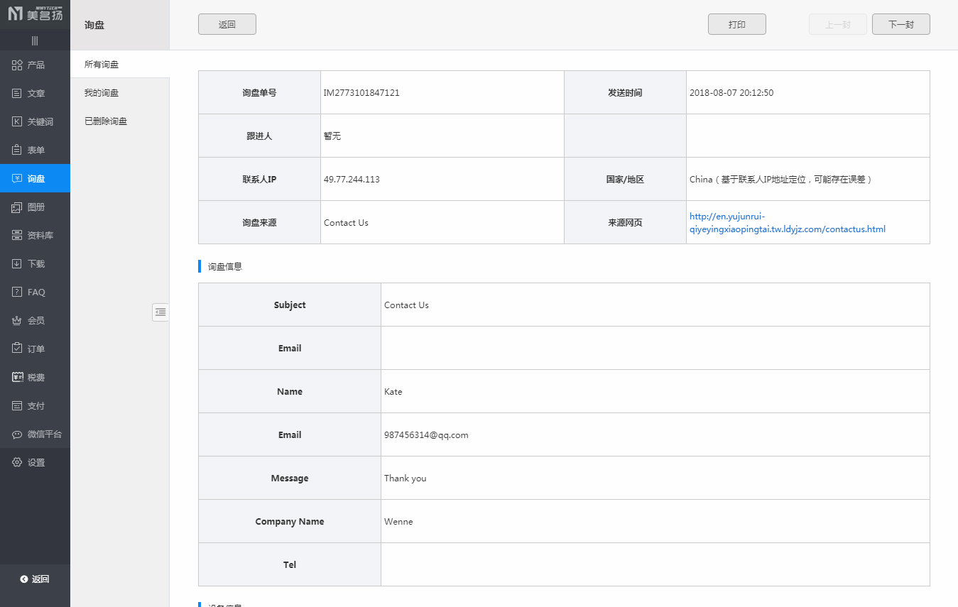点击某条询盘,进入查看具体询盘信息,如下图所示。