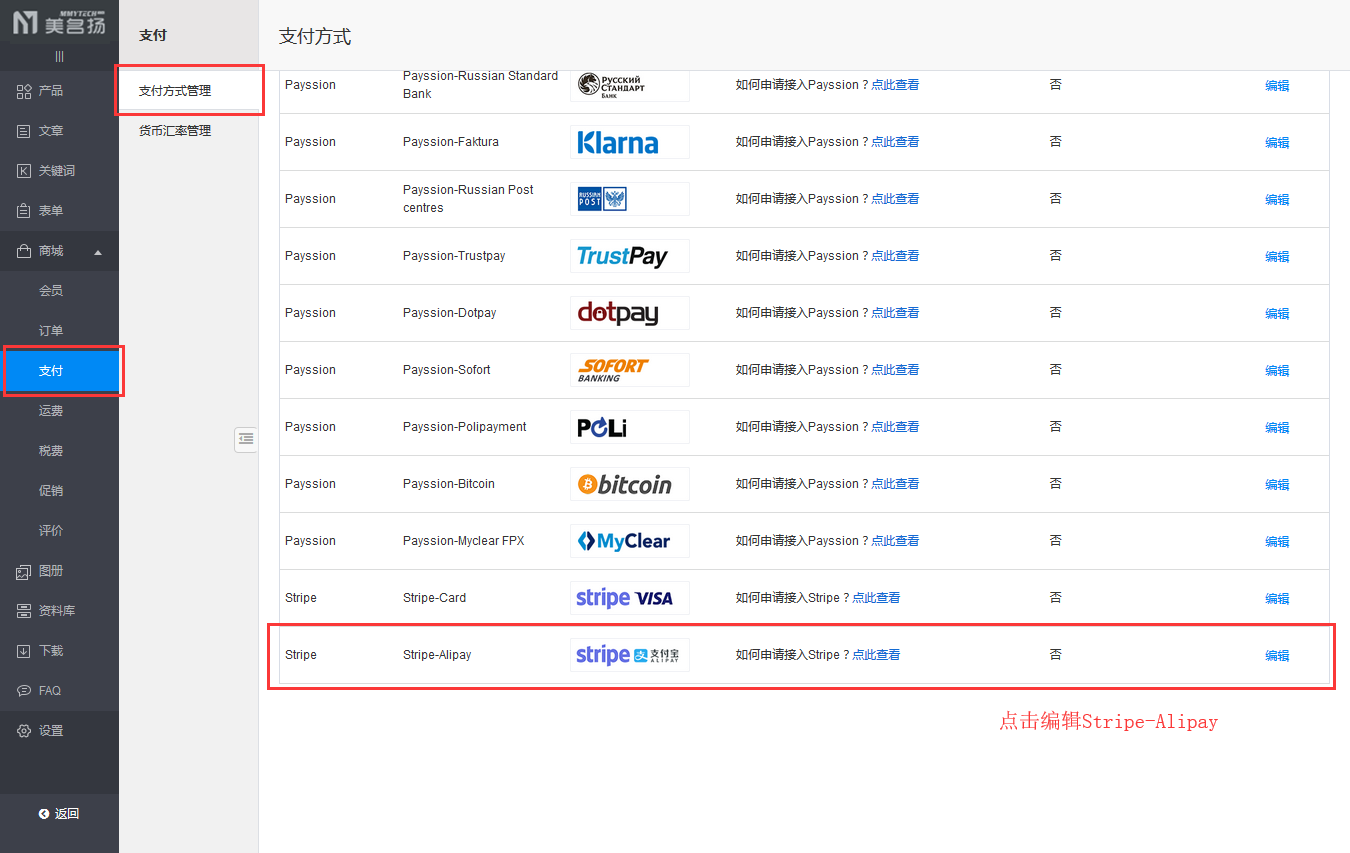 【操作方式】后台商城管理-》支付方式管理-》编辑Stripe-Alipay支付。