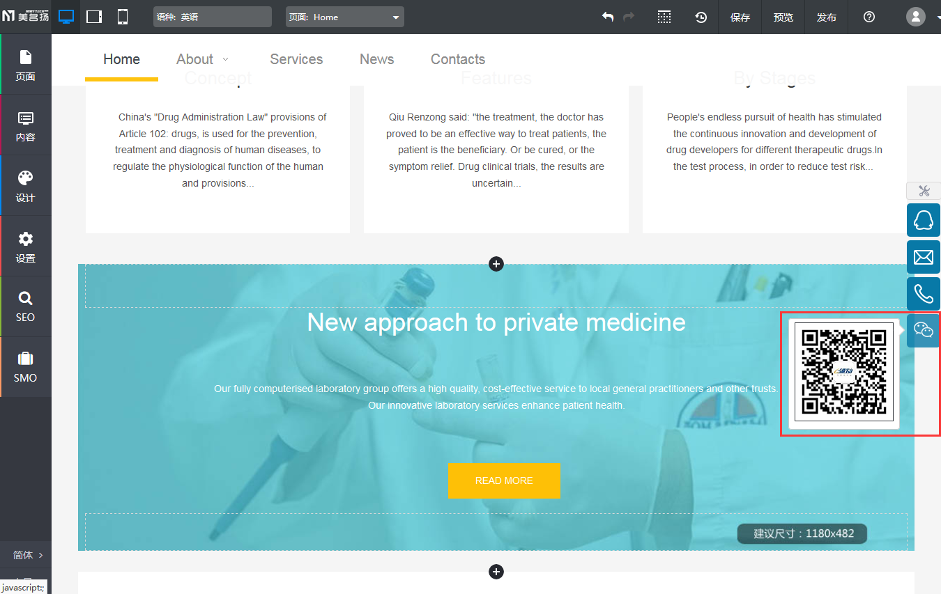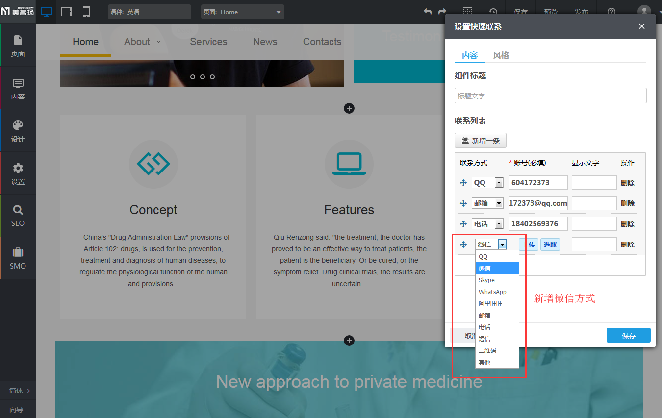 【操作方式】登陆进入-》编辑网站-》快速联系组件设置-》新增联系方式-》选择微信。