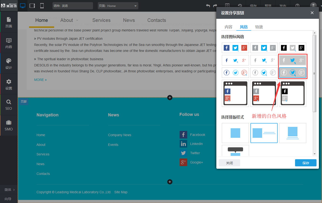 【操作方式】登陆进入-》编辑网站-》分享组件/社交关注组件设置-》风格-》选择新增的白色风格。