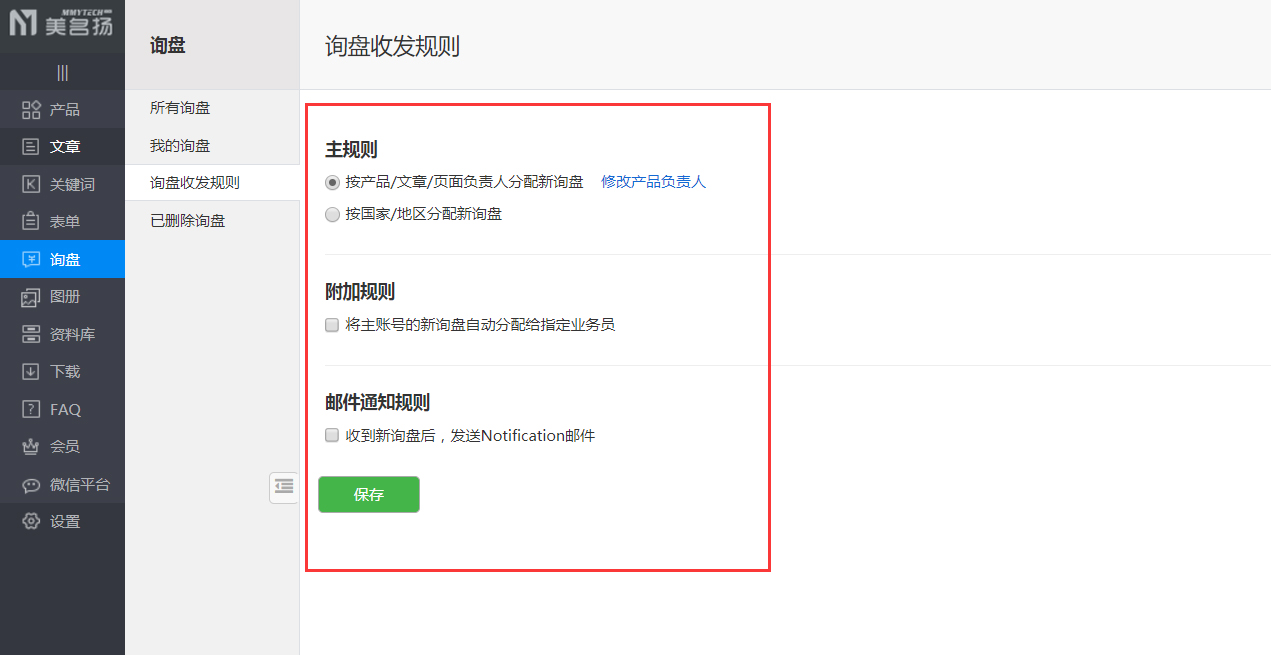 1、优化询盘邮件提醒规则,支持按照产品、文章、页面的负责人进行询盘分配;