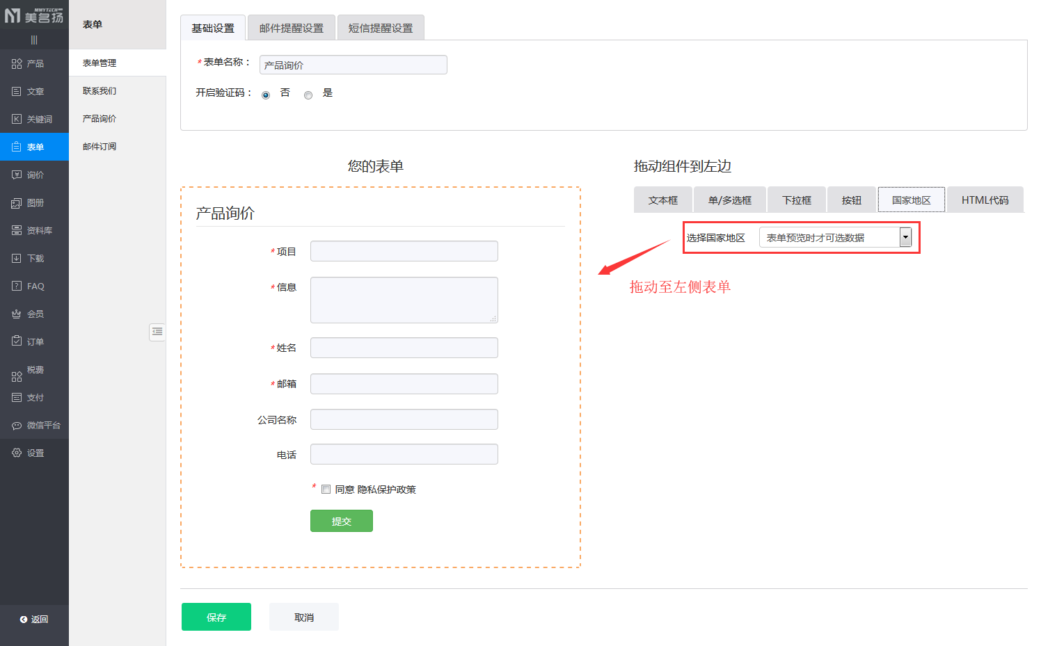 拖动“国家地区”选择项到左侧表单项。