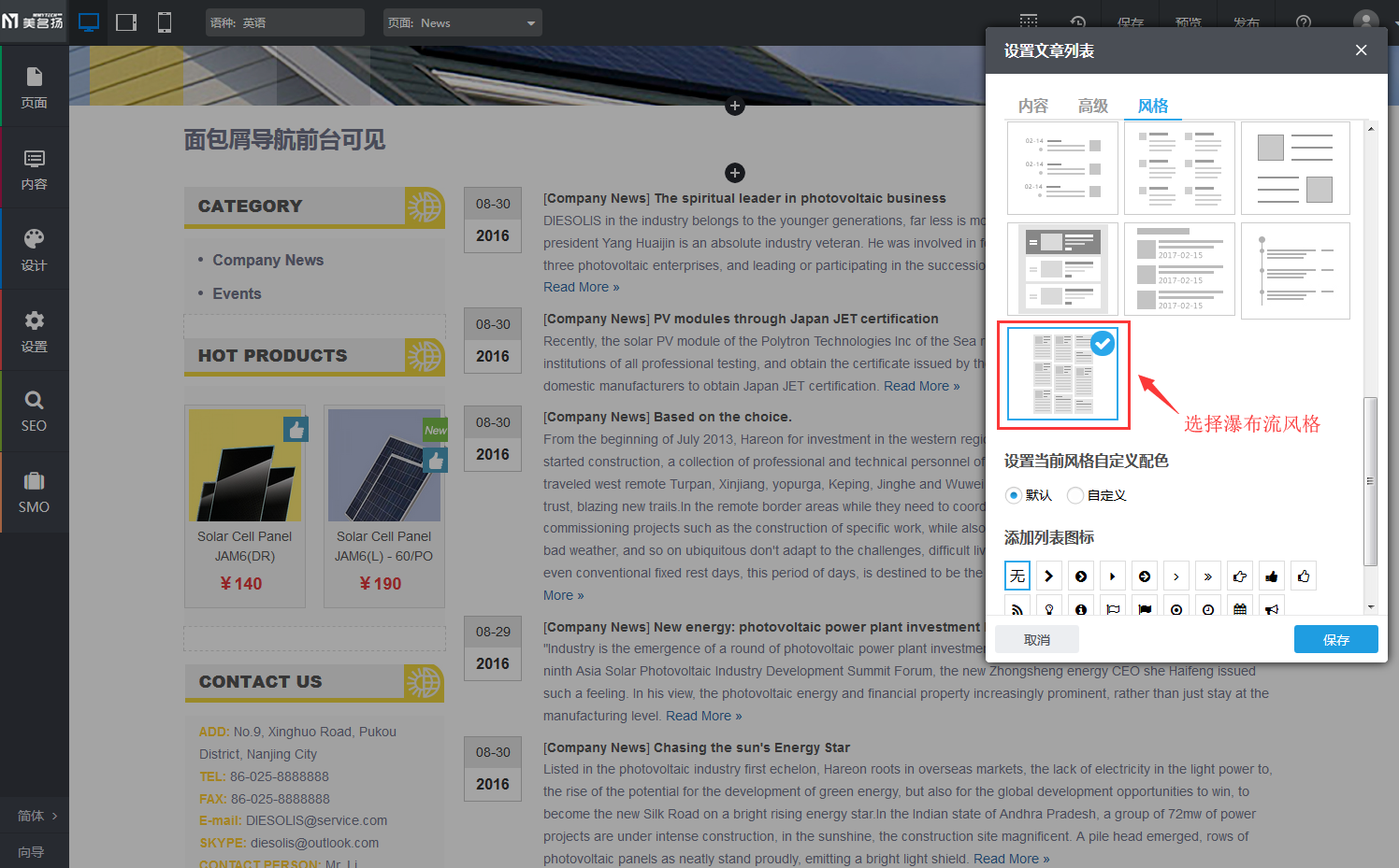 【操作方式】文章列表组件设置-》风格-》选择展示风格(瀑布流排版风格)。