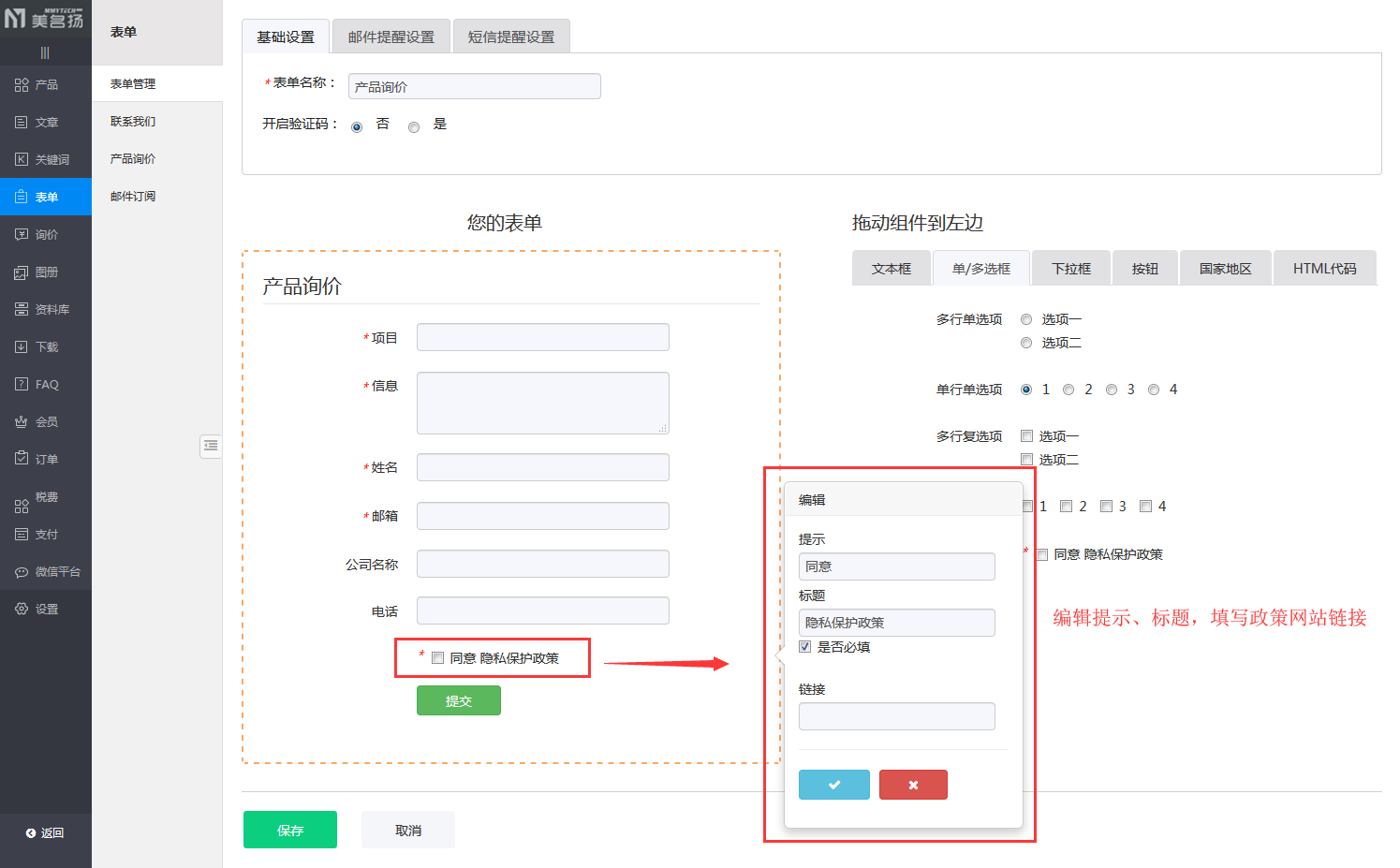 1、应欧盟数据政策修改要求,表单配置项中增加“隐私保护政策”勾选项;