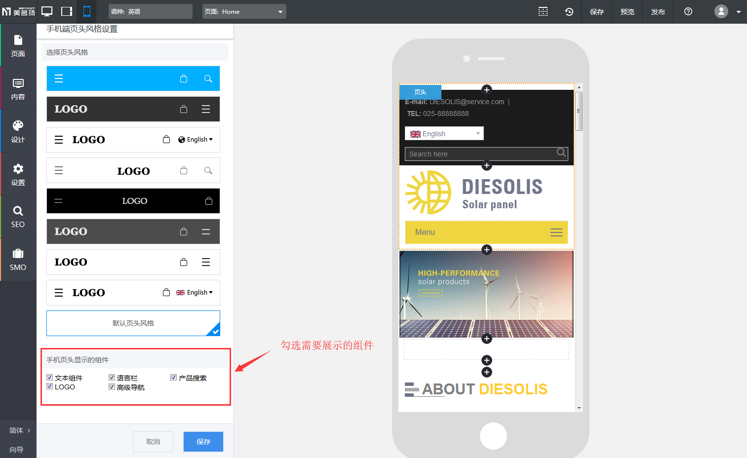 【应用场景】用户需要对手机端网站的页头内容进行调整时,可以在默认页头风格下勾选需要显示的组件,满足用户对于页头展示内容的需求,在页头过于简约和页头全部展示之间找到一个平衡点。