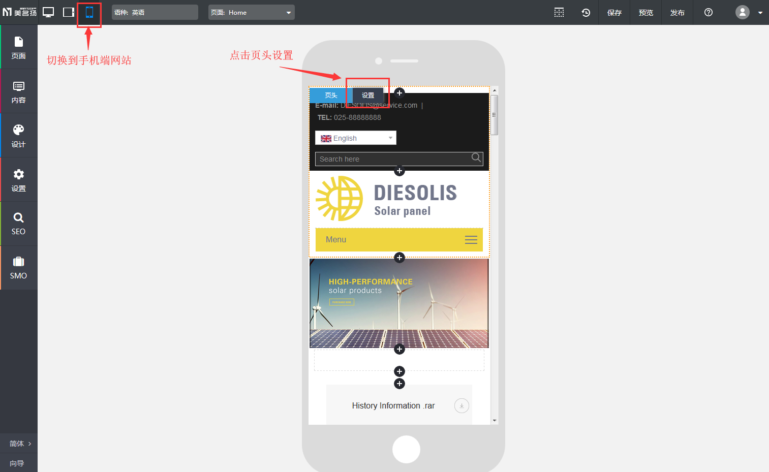 【操作方式】切换到手机端网站-》页头设置。