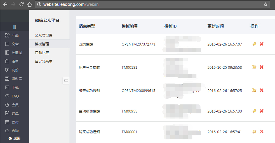 第3步:在网站后台可以进行模板管理、设置自动回复内容、设置自定义菜单。
