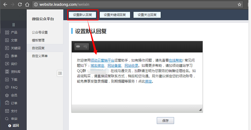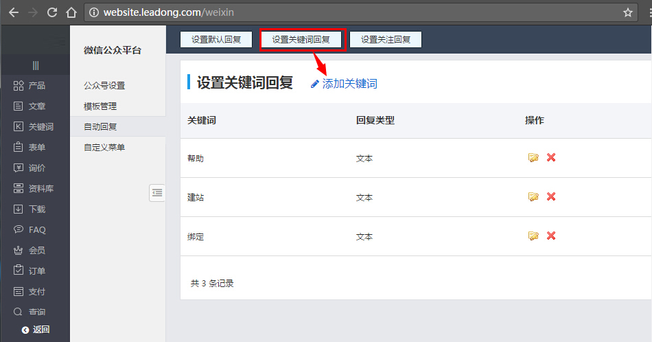 自动回复内容包含:默认回复、关键词回复、关注回复