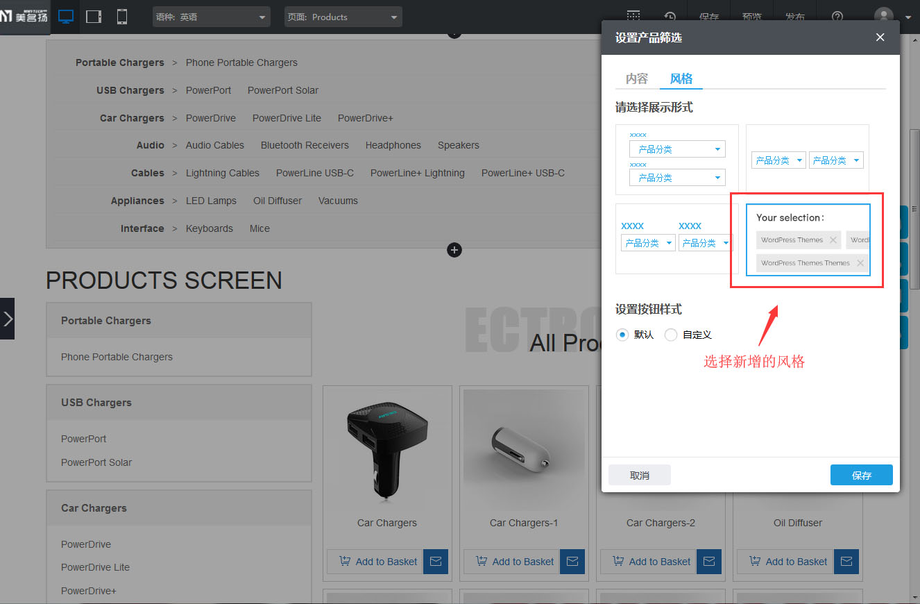 风格-》设置产品风格切换开启,勾选想要添加的前台切换风格。