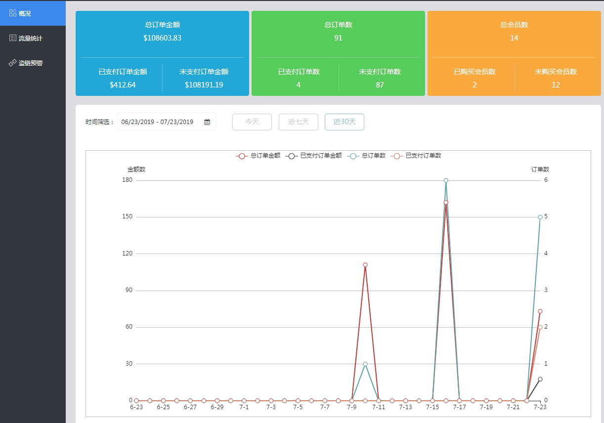 【应用场景】根据客户的需求,在B2C商城网站的“运营罗盘”中展示网站的销售数据统计,用户可以查看订单金额、订单数以及会员数的统计数据;