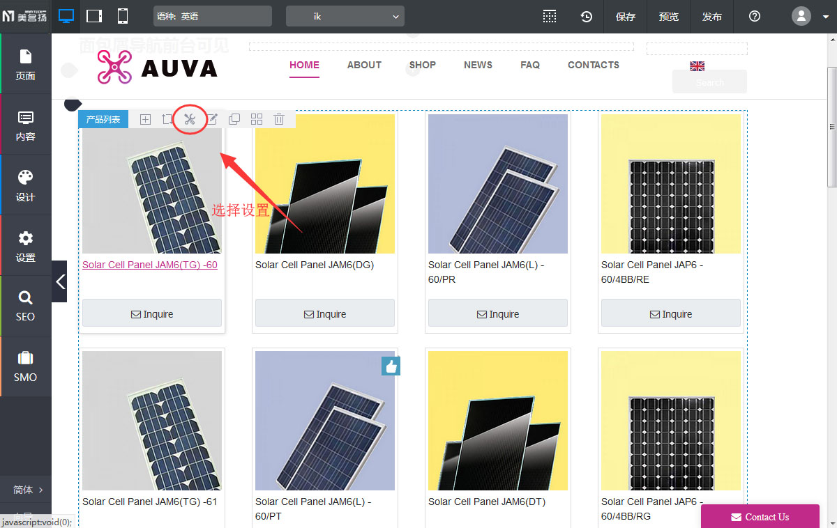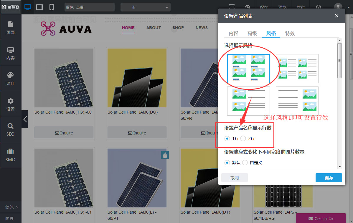 2、产品列表组件设置中新增“产品名称显示行数”设置项,可选值有:两行、一行,默认值为“两行”(此项功能针对产品列表组件的风格1)。