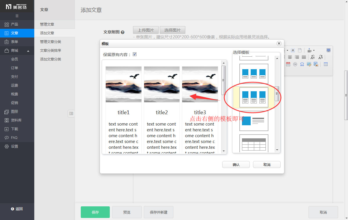 【应用场景】用户在后台使用富文本编辑器时,可以使用模板功能添加文本模板,比如虚线/实线分割符、图片与文字环绕的排版、表格、一行两列图文混排、一行三列图文混排等。方便用户快速有效的编辑文本,省去对文本进行排版的时间。