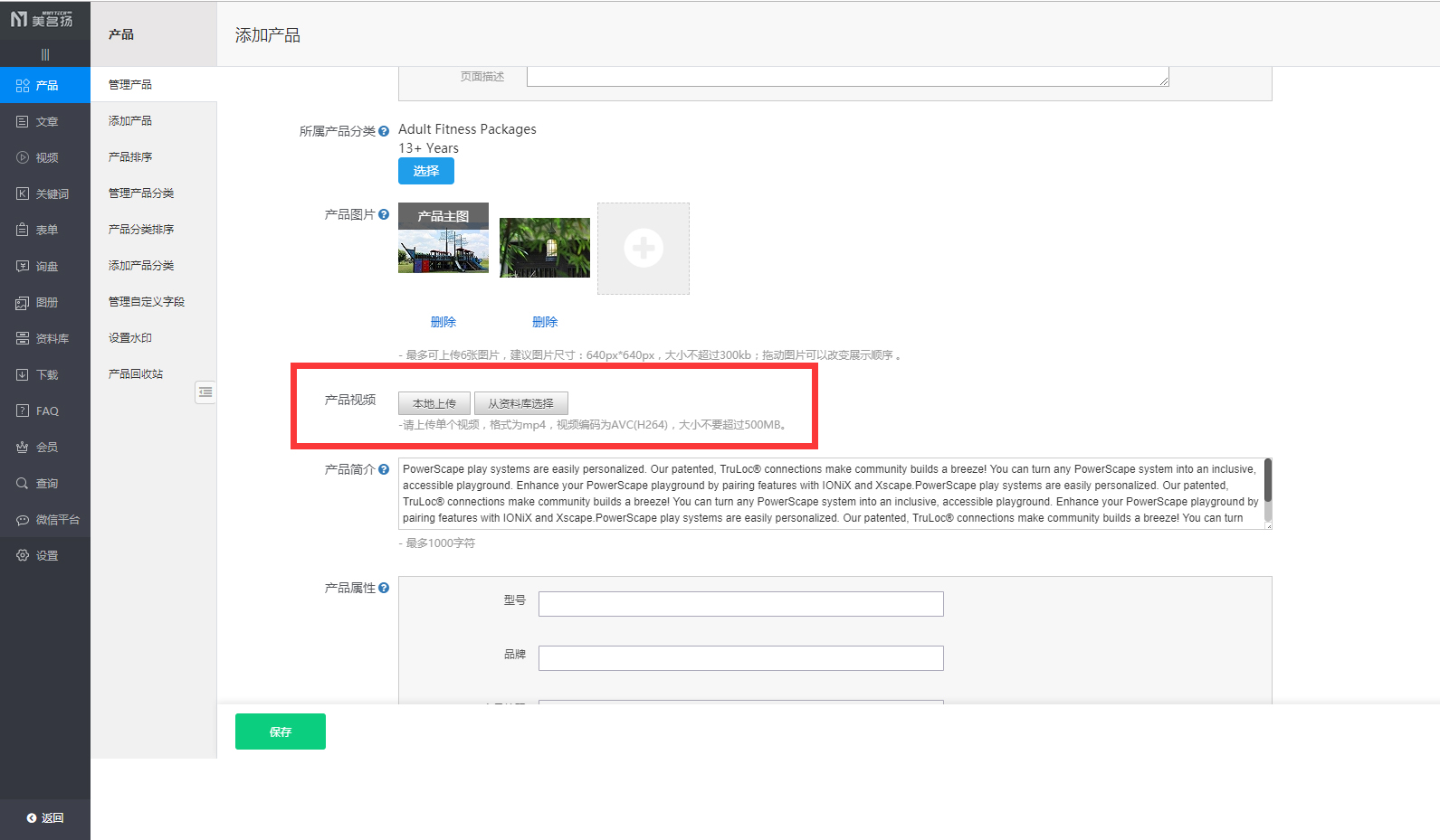 【操作入口】进入后台内容管理》产品管理》产品视频,点击从本地上传或者从资料库中上传格式为MP4,编码为AVC(H264),大小不超过500MB的短视频。