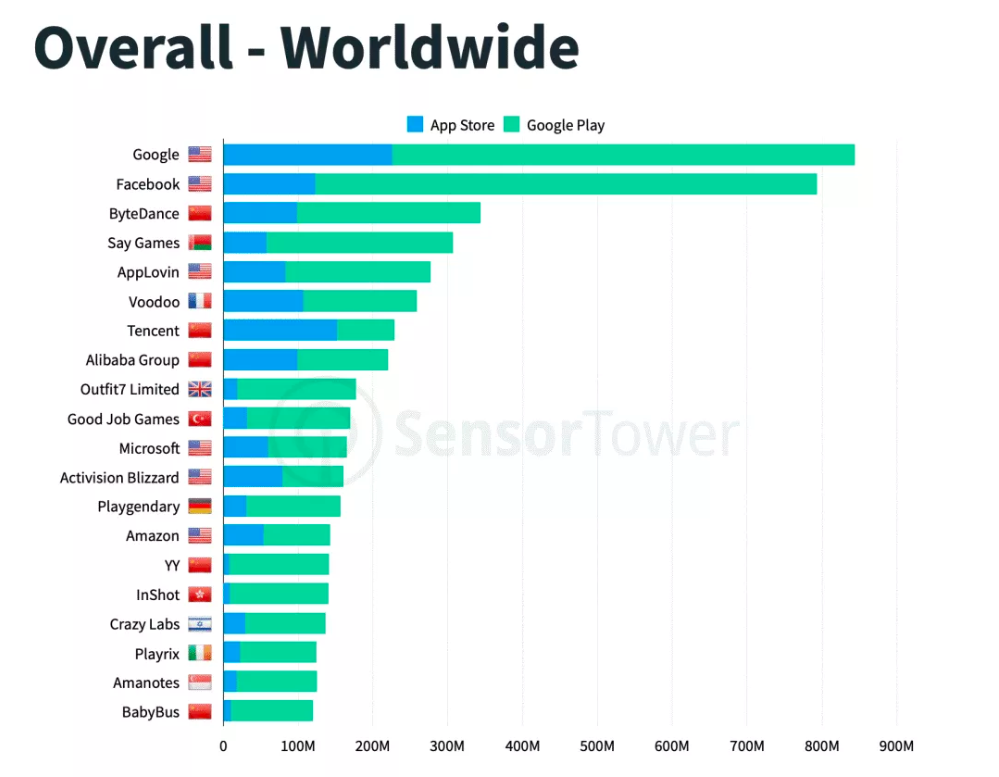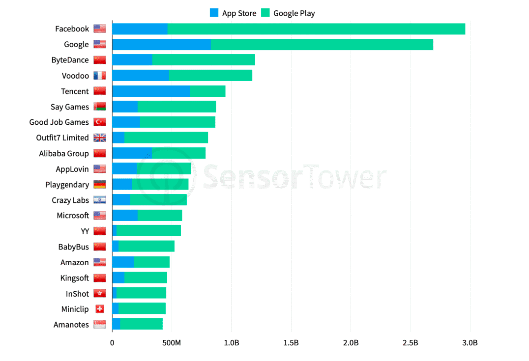 根据应用智能监控器Sensor Tower的数据,在2019年最后一个季度,谷歌的下载量接近8.5亿次,而Facebook的下载量接近8亿次。