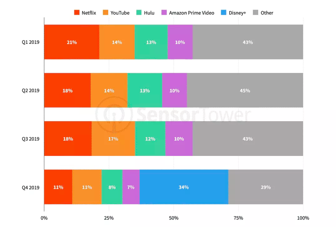 在11月份进入应用程序市场后不久,它占领了点播流媒体市场34%的份额。它还在2019年第四季度获得累计下载超过3000万次,首30天的收入超过5,000万美元。考虑到它起伏不定,这很疯狂。
