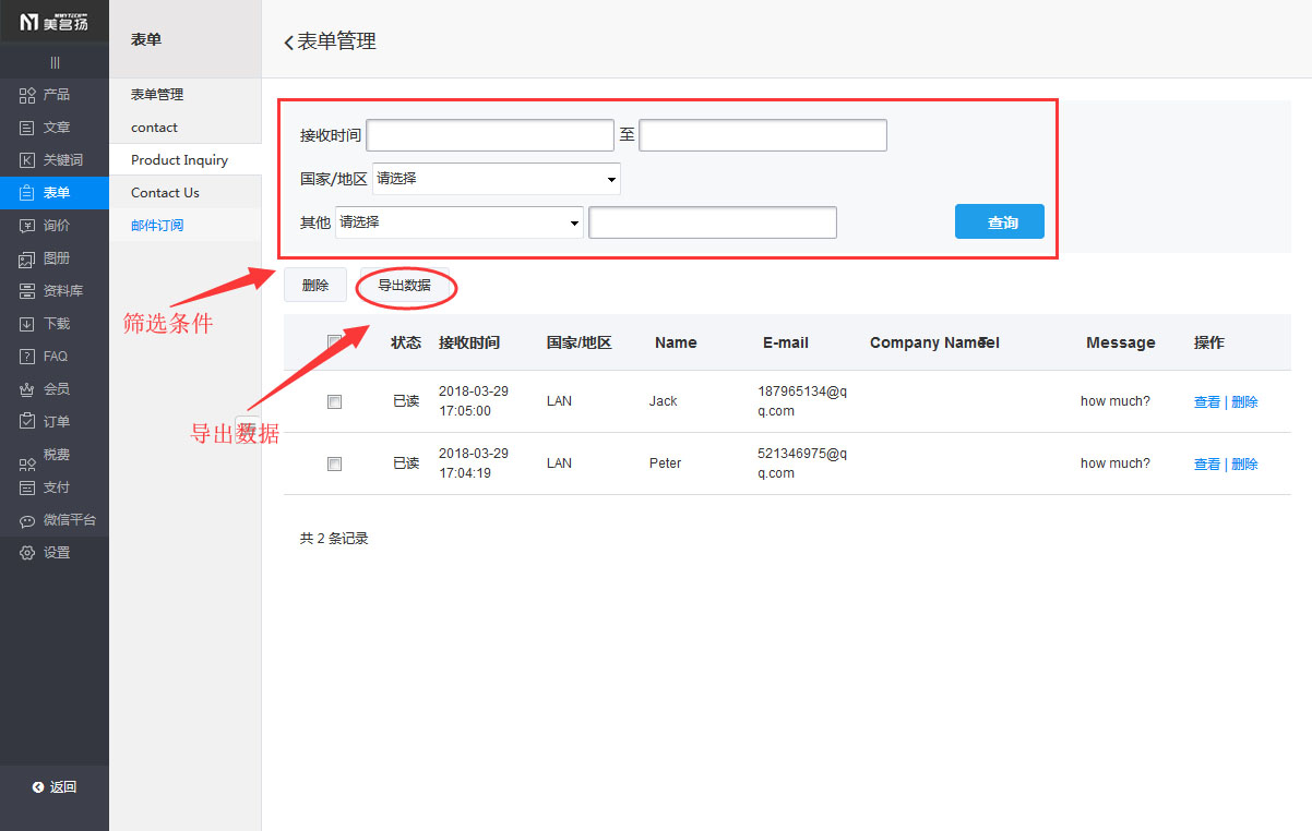 2、“表单管理”导出数据时可以根据筛选条件导出,并且能够附带产品信息