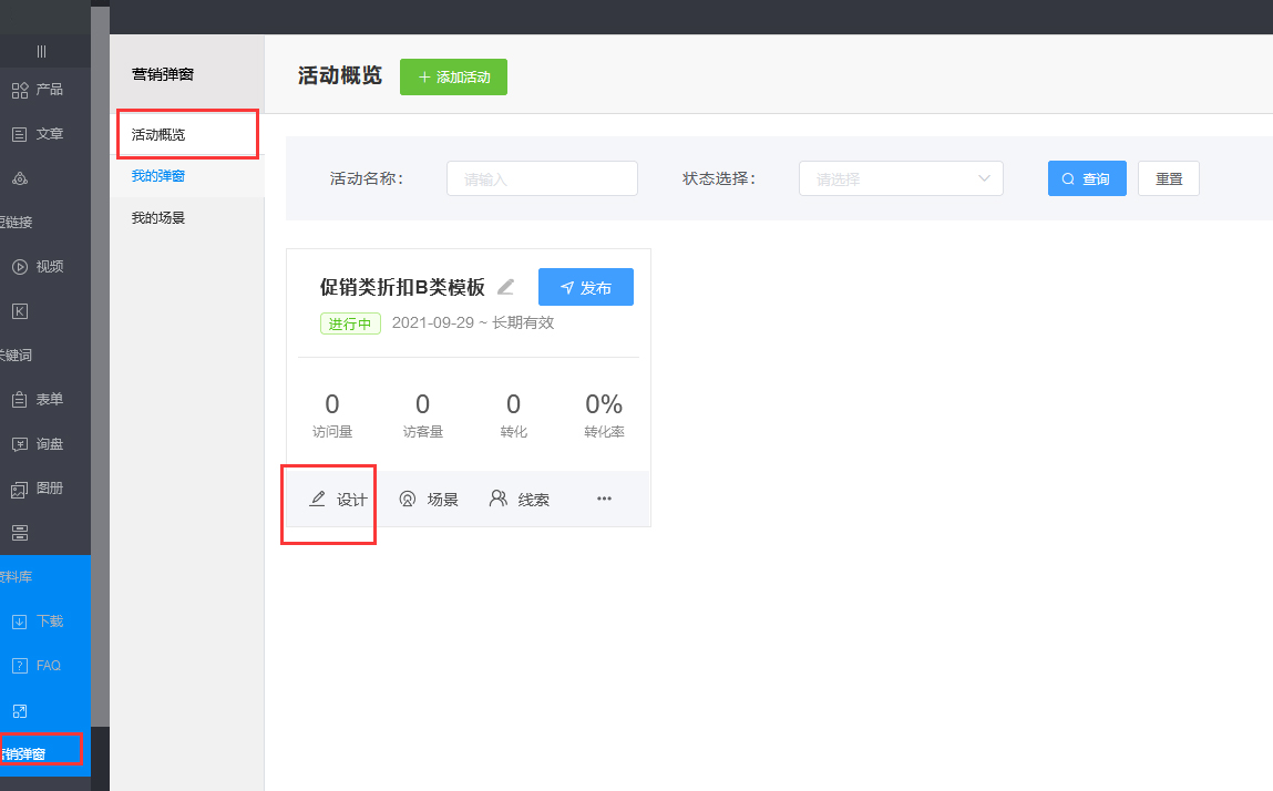 l 活动创建完成后,需要在活动概览中,点击“设计”按钮进入该活动弹窗的样式设计界面。如下图所示: