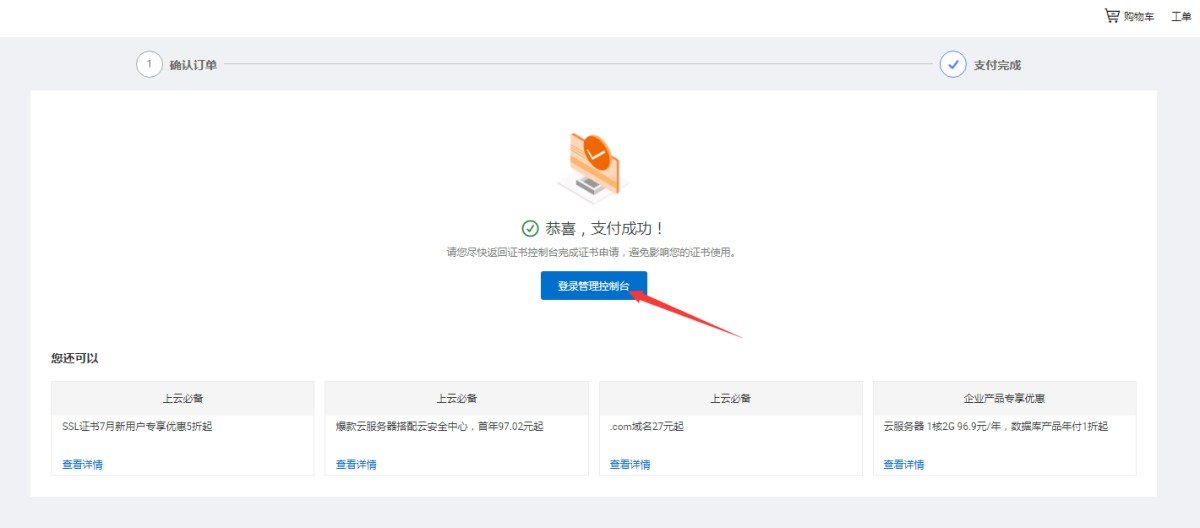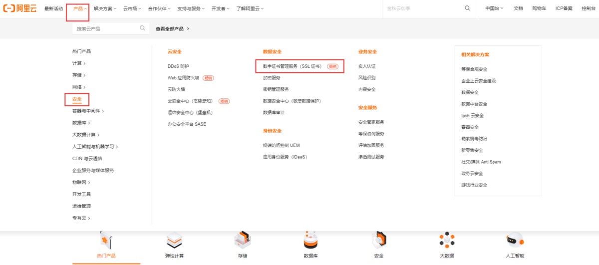 1, 登录阿里云https://www.aliyun.com(如果域名是在阿里云购买的,建议登录同一账号),点击产品-安全-SSL证书。