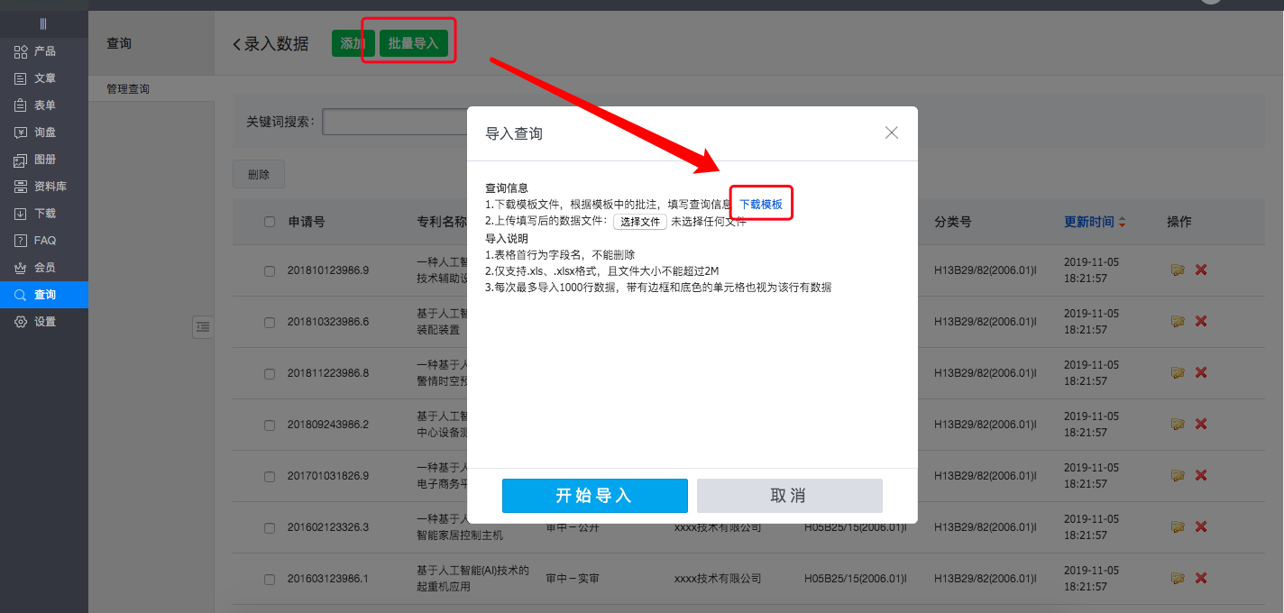 点击“批量导入”按钮,在弹窗中下载模板,如下图所示: