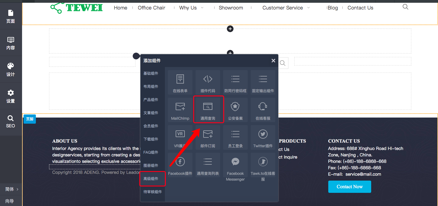 打开“编辑网站”界面,添加“高级组件”-“通用查询”组件,站点发布后访客即可在此页面进行数据查询,如下图所示: