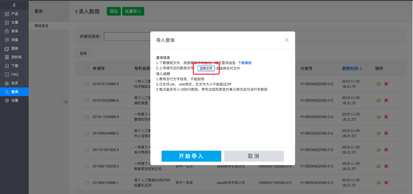 在网站后台的弹窗中点击“选择文件”按钮上传excel文档,点击“开始导入”进行数据批量导入,如下图所示: